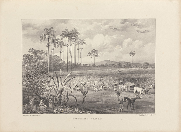 The need for laborers to work vast sugar cane plantations in the British-colonized Caribbean led to the creation of medicalized theories of racial differences that continue to influence physicians during the postcolonial period and today. Cutting Canes, by Richard Bridgens, a British artist working in the 1850s, depicts scenes from a sugar plantation in Trinidad where the artist’s wife had inherited land. SOURCE: YALE CENTER FOR BRITISH ART