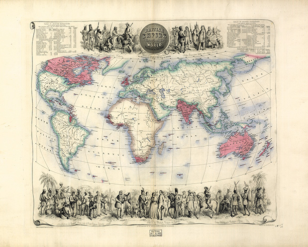 The map titled British empire throughout the world exhibited in one view, 1850, by the cartography firm of John Bartholomew, illustrates the British Empire’s vast holdings of land and people. SOURCE: LIBRARY OF CONGRESS