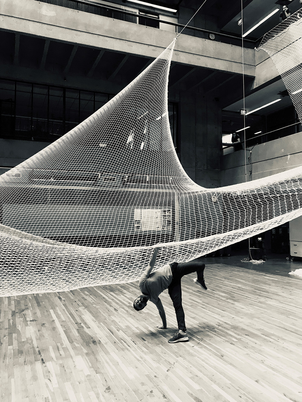 works that generate a new understanding of how nets turn rigid when loaded and soften when unloaded. At the same time, dancers will explore the interaction between net and human. Photo by Sigrid Adriaenssens